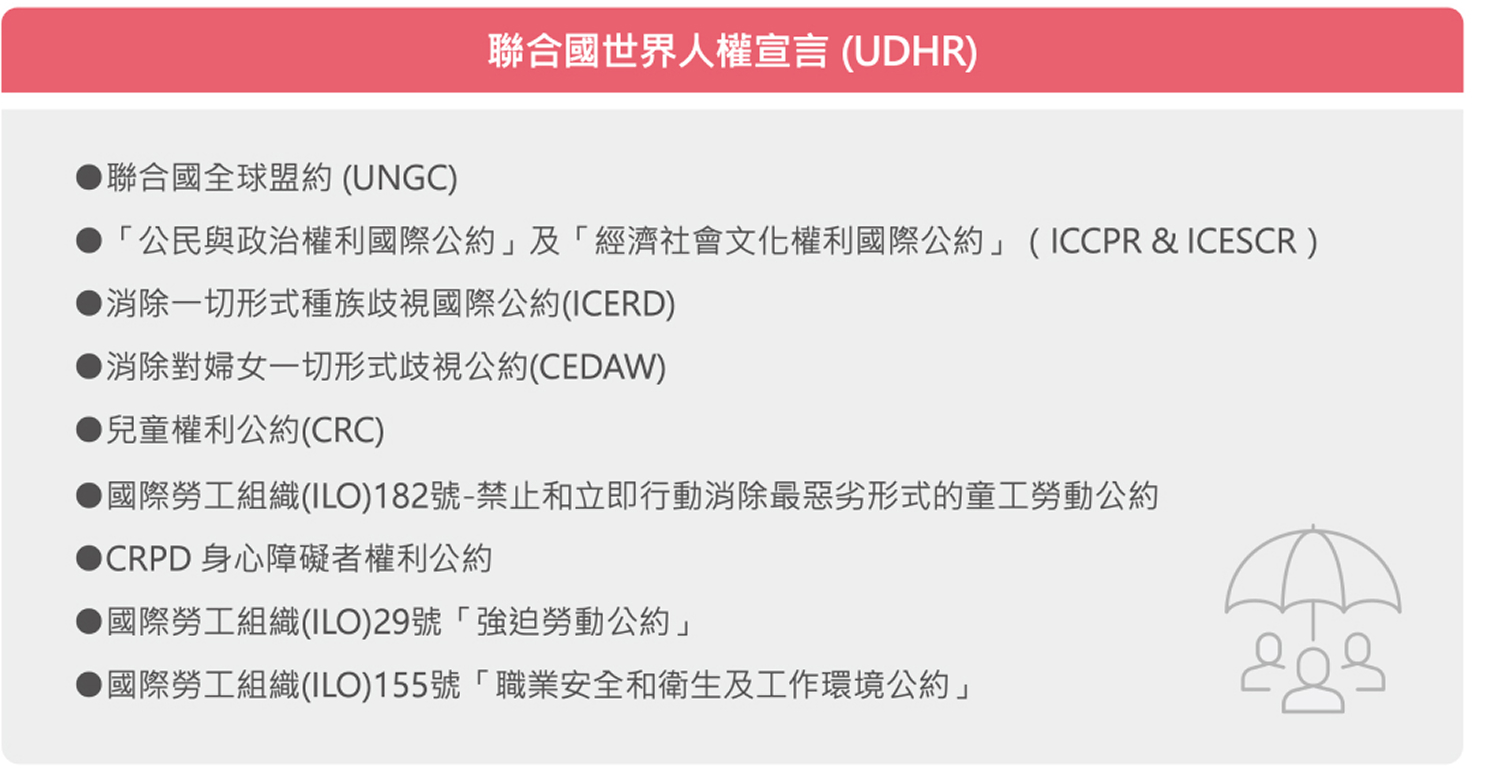 - 內容包含:禁止強迫勞動、禁止童工、反歧視、反騷擾等。