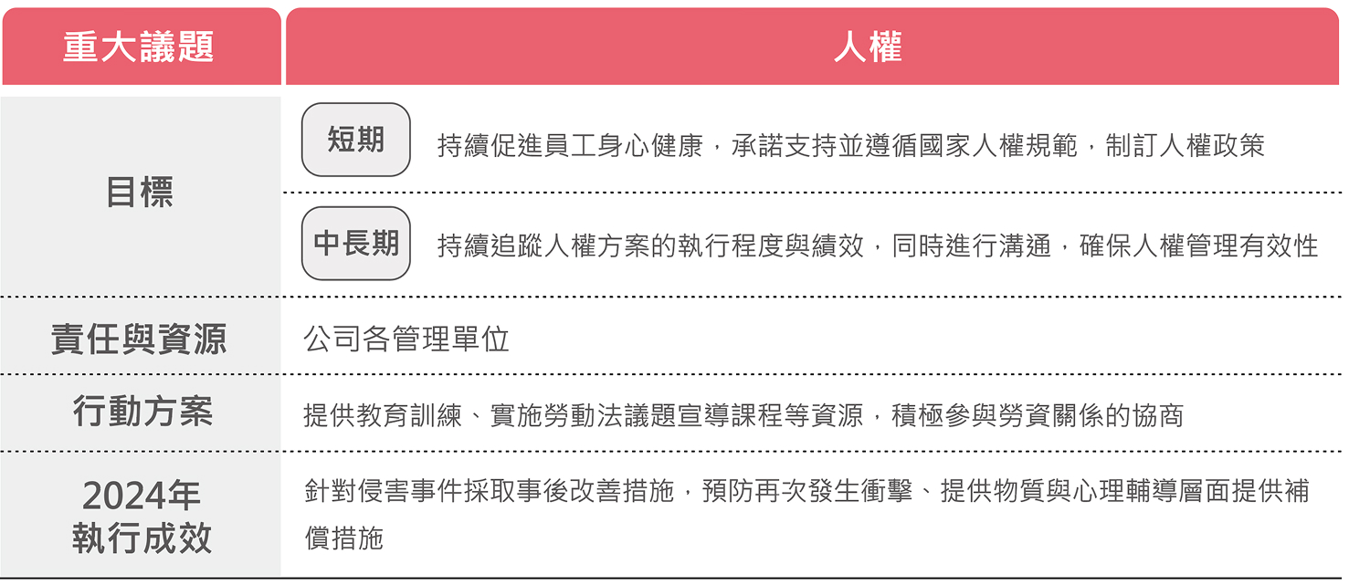 - 透過制度化的 PDCA 管理循環,落實風險管理及安全、衛生、環保之持續改善及災害預防,並重視員工之身心傷害及疾病預防。